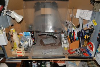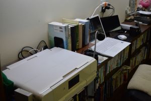 手前から、A3プリンタ、辞書類、